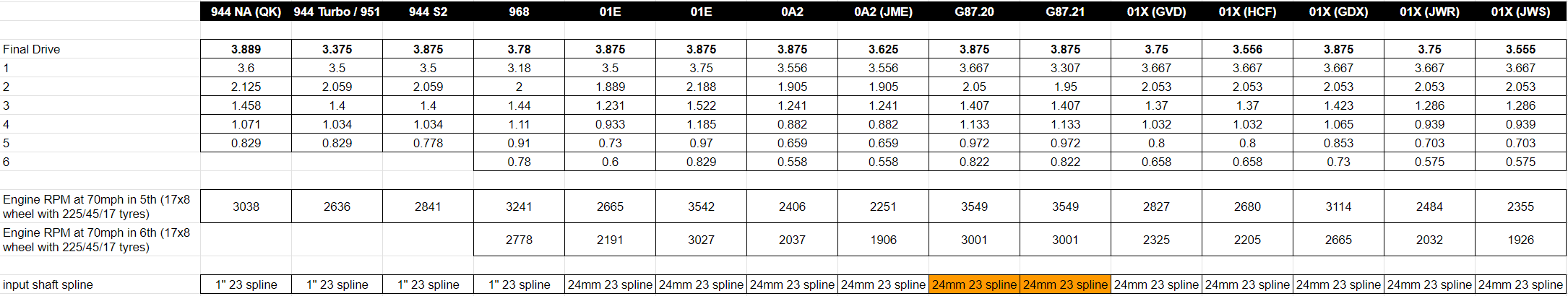 Below are what I believe to be the majority of ratios available for each transaxle. There are often multiple gearbox codes for each ratio but some of the headings have a code included in brackets.