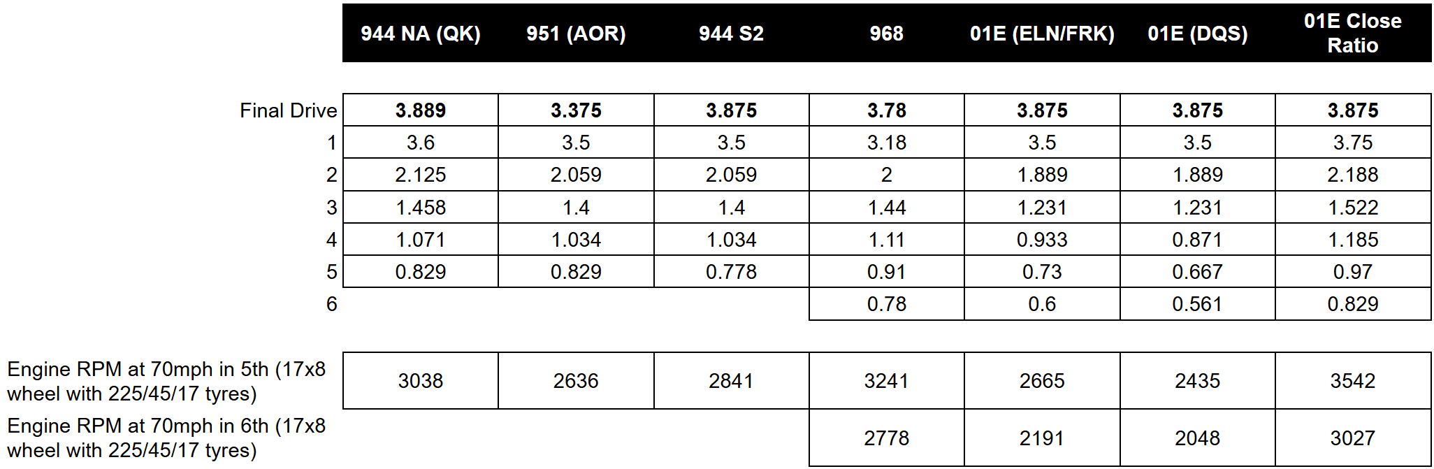 There are a few different gear ratios to choose from for the 01E but the variants I most commonly recommend have the below ratios. If you require something different then let me know and I can share more info on the other options. At the bottom are some example figures for RPM at 70MPH to make it a bit easier to follow: